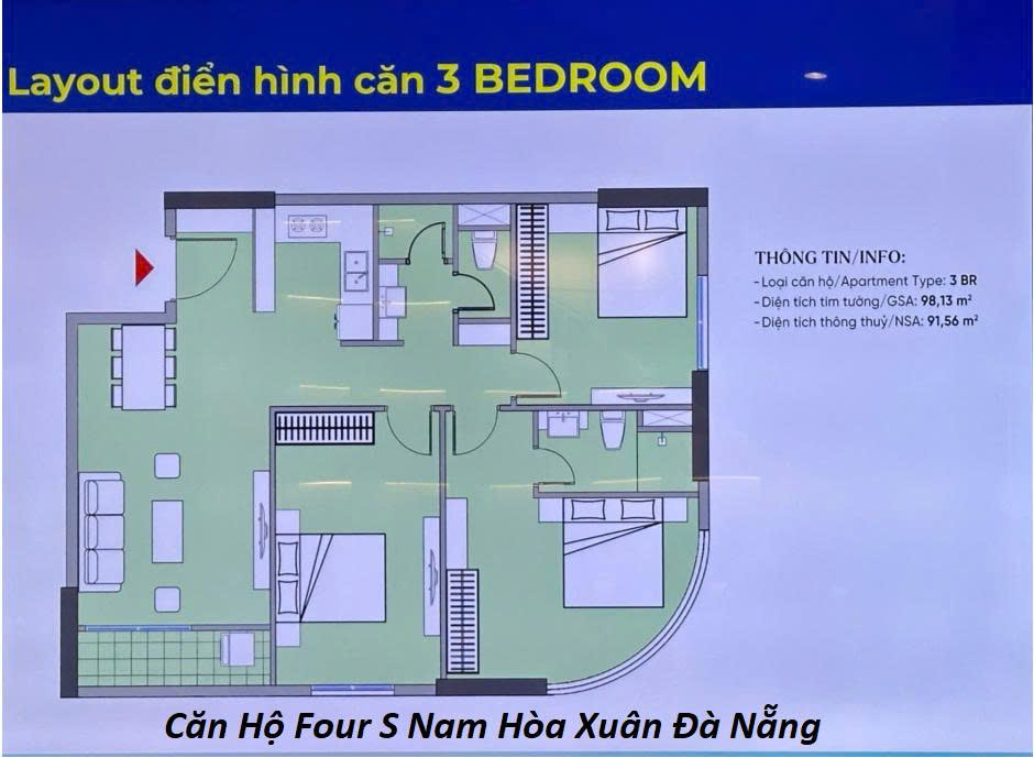 Căn 3 phòng ngủ FourS Đà Nẵng tại căn hộ FourS Tower là dòng sản phẩm cao cấp, phù hợp với gia đình đông thành viên hoặc khách hàng tìm kiếm không gian sống rộng rãi, riêng tư tại khu Nam Hòa Xuân. Căn hộ có diện tích dao động từ 80–100m², được thiết kế tối ưu với phòng khách rộng, bếp riêng biệt và 3 phòng ngủ tách biệt. Mặt bằng tại chung cư FourS Đà Nẵng chú trọng sự thông thoáng khi tất cả các phòng đều có cửa sổ hoặc ban công, giúp đón ánh sáng và gió tự nhiên.